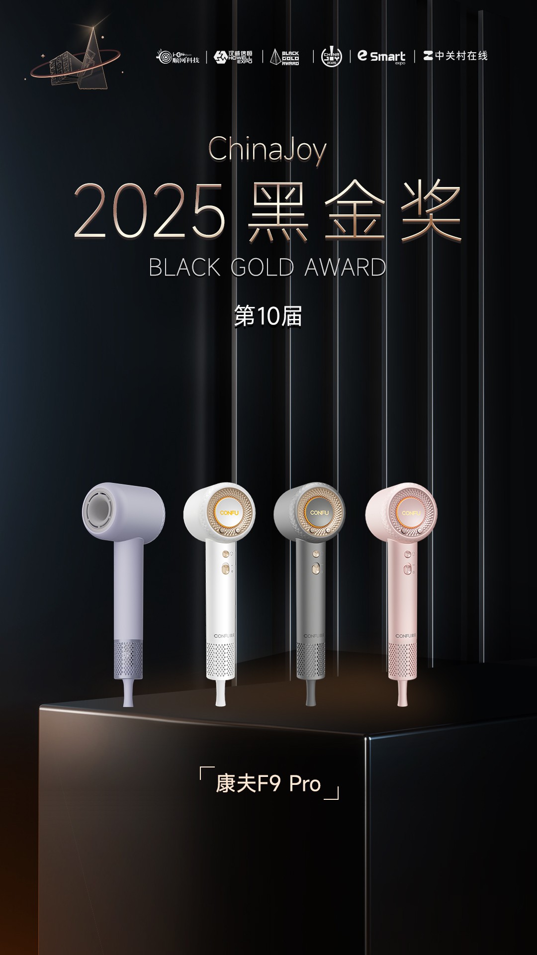 2025年8月2日,第十届ChinaJoy黑金奖(BlackGoldAWARD)正式揭晓。康夫品牌旗下年度旗舰康夫F9 Pro,凭借着优秀的设计、出色的头发养护性能,荣获2025年度黑金奖。