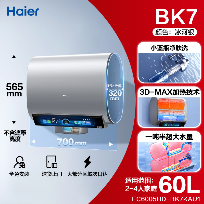 海尔小蓝瓶BK7 EC6005HD-BK7KAU1储水式电热水器,60升大容量搭配3500瓦速热性能,满足全家洗浴需求,智能变频加热技术高效节能,专利防电墙科技全面保障洗浴安全,内胆采用优质搪瓷涂层,抗腐蚀更耐用,支持多段加热模式,灵活匹配不同季节用水习惯,外观设计简约时尚,小蓝瓶系列颜值出众,安装便捷适配多种 bathroom 环境。