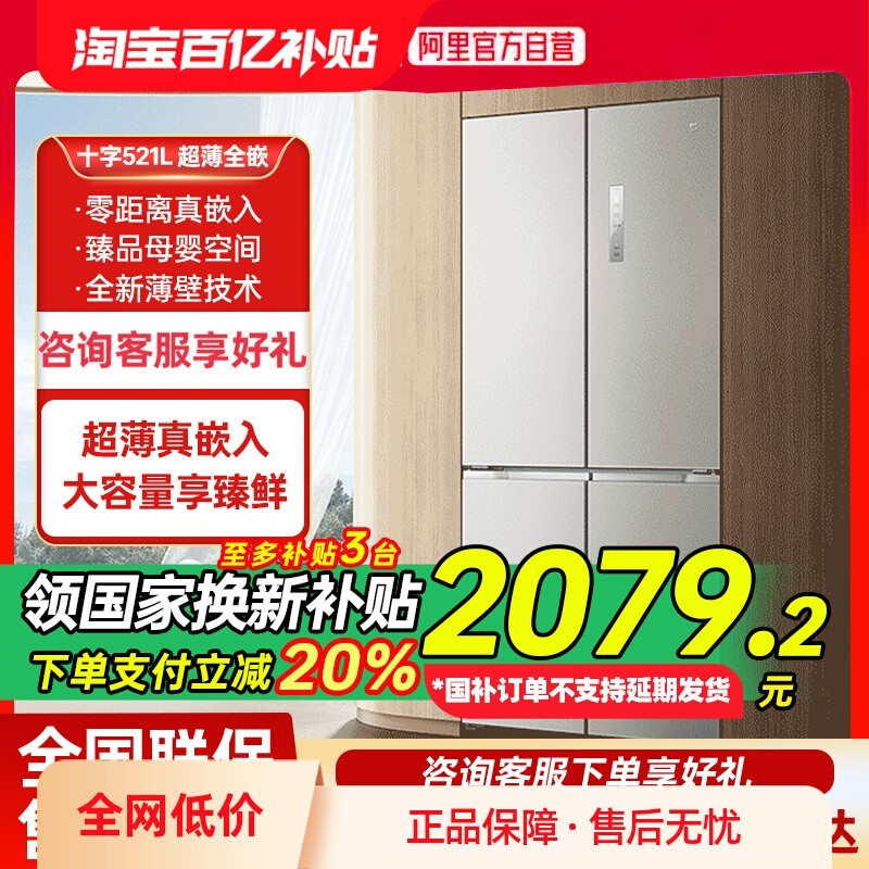 米家MIJIA BCD-521WMBI风冷十字对开门冰箱,现活动售价3099元,参与补贴享受20%起减519.8元优惠,下单1件实付低至2079.2元,超值入手正当时!这款冰箱拥有521L大容量,科学分区设计,其中冷藏室341L,冷冻室180L,满足全家食材存储需求。采用零距离嵌入式设计,底部散热结构与嵌入式铰链让冰箱可无缝贴合橱柜,左右无需预留空间,美观又省地。创新使用VIP真空隔热材料,在保证出色保温性能的同时让箱体更薄,提升空间利用率。搭载变频压缩机与变频风机组合,运行安静节能,温度控制更精准,达到国家一级能效标准,冷冻力高达7kg/12h。冷藏室配备干湿可调及独立变温抽屉,灵活调节湿度与温度,有效延长果蔬、干货、珍品等不同食材的保鲜周期。内置银离子抗菌系统,实现99.99%高效抗菌率和93%以上净味率,时刻守护食材健康与冰箱内部清新环境。智能风冷技术避免结霜烦恼,免去除霜困扰,使用更省心。高品质对开门设计,简约时尚,搭配智能控温系统,让保鲜更进一步,是现代家庭理想之选。