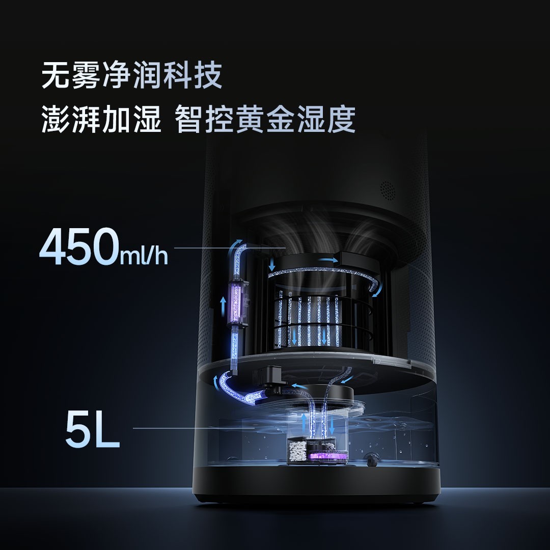 首先是行业领先的无雾冷蒸发加湿技术,通过湿帘循环系统模拟自然蒸发过程,让水分子像晒衣服一样均匀扩散到空气中,有效避免传统加湿器产生的“白粉”污染问题。5L大容量水箱配合450ml/h加湿量,可在1小时内提升50m³空间湿度39%,实现持久润泽而不潮湿的舒适体验。