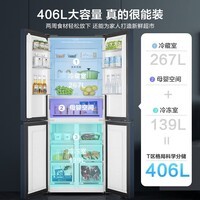 海尔Haier BCD - 406WLHTDEDB9风冷十字对开门冰箱,容量达406L,星石蓝外观非常美观。这是22年4月新上市的一级变频大容积冰箱,新一级能效,风冷无霜,智能双变频,一天仅需0.78度电,非常节能省电。它还具备三挡变温功能,可以灵活选择变温模式,并且有DEO净味保鲜功能,让食品不串味。680mm嵌入式纤薄机身,不占空间,还有特有的母婴模式下的母婴洁净呵护空间。