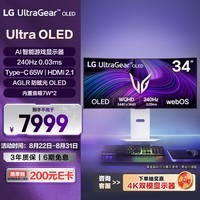 LG 34英寸 Ultra OLED显示器 34GX90SA 白,采用先进的OLED显示技术,带来深邃的黑色表现与绚丽的色彩还原,屏幕尺寸为34英寸,支持240Hz高刷新率,响应速度快至0.1ms,轻松应对高速画面,游戏体验流畅无拖影。配备HDMI 2.1接口,支持Type-C 65W反向充电,连接更便捷。内置音箱与webOS智能系统,打造沉浸式影音与办公体验。