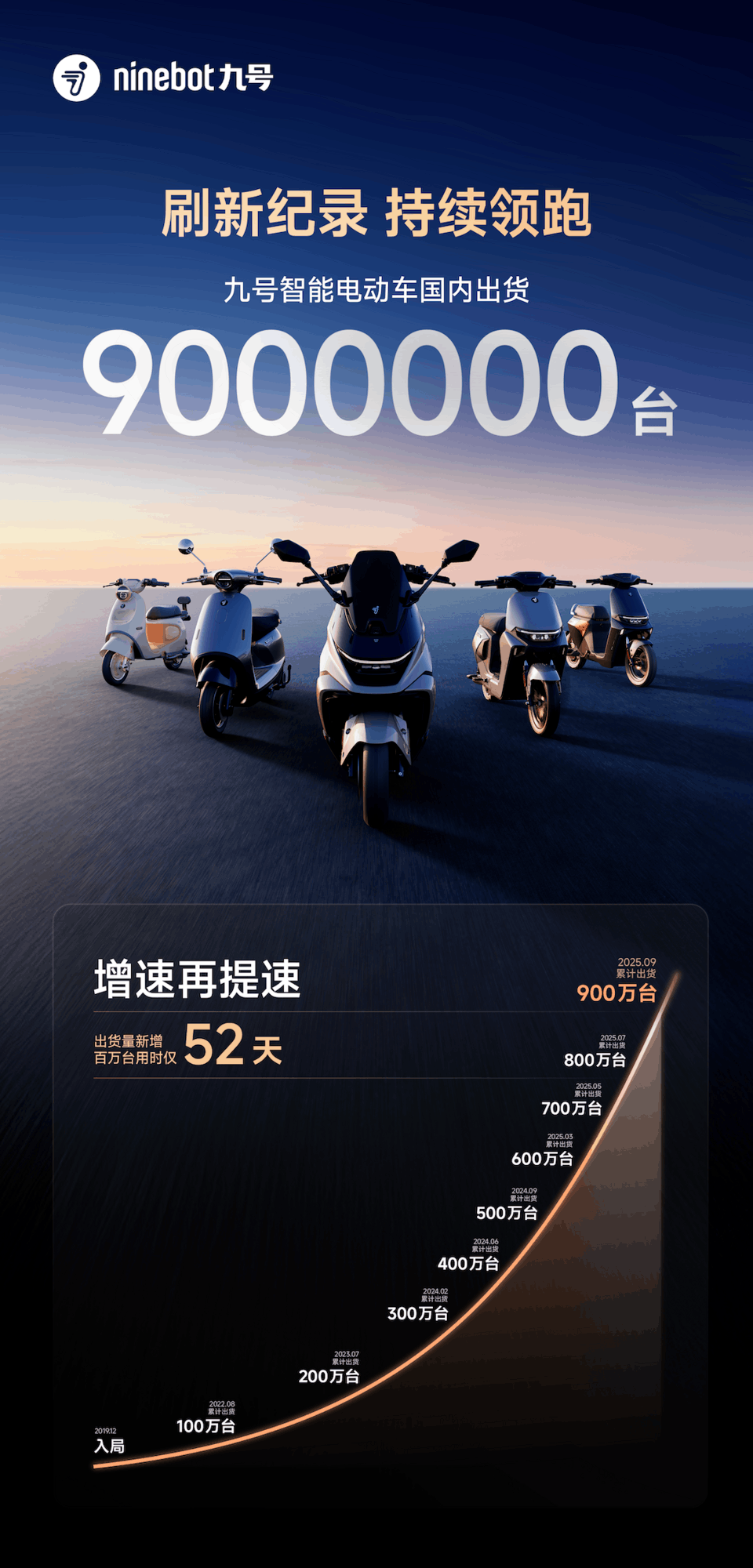 2025年9月8日,九号公司宣布旗下智能两轮电动车国内累计出货量突破900万台,再度刷新行业增长速度纪录。从700万台到800万台,九号用时64天。而这一次,从800万台到900万台,九号仅用时52天,以更快增速突破“中国智造”新高度,展现智能两轮领域头部品牌的强劲增长势能。