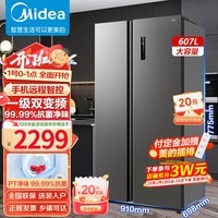 美的607升对开门冰箱,大容量精储空间,轻松满足全家一周食材存储需求,双变频一级能效设计,节能静音同时提升保鲜效果,搭载净味除菌技术,守护食材持久新鲜,风冷无霜设计免去手动除霜烦恼,智能薄型机身支持嵌入式安装,释放更多家居空间。