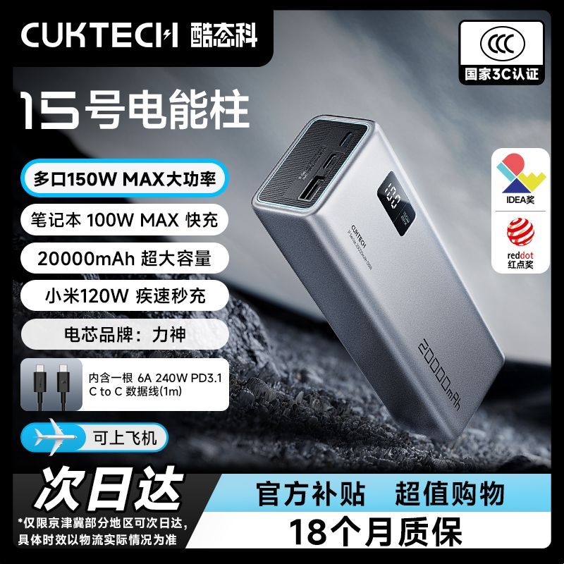 CUKTECH酷态科15号电能柱移动电源,20000mAh大容量搭配1A2C三接口设计,最高支持150W输出功率,轻松满足多种设备快充需求。采用4颗21700动力电芯,额定能量73Wh,可随身带上飞机,出行无忧。内置LED智能数显屏,实时显示剩余电量,尺寸1635739.9mm,仅重450g,便携实用。支持PD3.1、UFCS融合快充、QC3.0、PPS等多种协议,兼容小米、华为、OPPO、VO等多品牌手机、平板、笔记本及Switch设备。双击开关还可进入小电流模式,适配蓝牙耳机、手环等设备。配备120W+33W+33W多口快充能力,即便三口同时使用,C1口仍可维持120W输出,轻松应对笔记本与手机同时充电需求。高规格散热系统搭载金属均热板和四重温控,保障长时间高功率稳定输出。附赠1m 240W 6A快充线,充手机电脑同样适用。