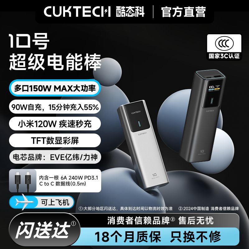 酷态科 PB100P 10号超级电能棒移动电源,大容量10000mAh搭配多口150W MAX快充,重量仅约287g,轻便易携却能量澎湃。支持手机、笔记本电脑等多种设备同时快充,配备TFT彩屏实时显示电量、功率、电压、电流等信息,充电更直观高效。内置多重快充协议,兼容UFCS融合快充以及PD3.0/QC3.0/PPS等主流协议,适用于小米、华为、OPPO、vivo等多品牌设备,满足手机、平板、Switch、笔记本电脑等各类电子产品快充需求。包装内附赠0.5m 240W6A快充数据线,支持PD3.1协议,充手机电脑皆高效。
