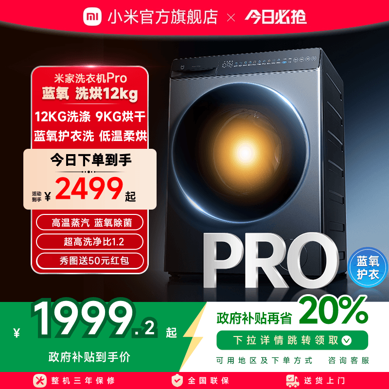 米家 MIJIA 小米滚筒洗衣机 12KG蓝氧Pro洗烘全自动型号XHQG120MJ102,现正火热促销中,采用创新蓝氧护衣技术,深层清洁同时呵护衣物纤维,洗护更健康,12公斤大容量搭配超薄机身设计,轻松应对家庭洗衣需求,且不占空间,大筒径设计方便取放衣物,运行安静高效,目前在天猫商城参加百亿补贴活动,原价3499元,现使用优惠券及国家补贴后,最终到手价仅需1999.2元,性价比极高,喜欢的朋友千万不要错过这次入手良机。