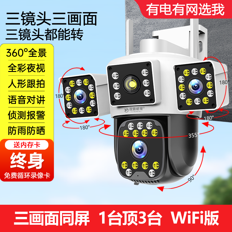 夜鹰威视摄像头360度无死角无线家用手机远程4G高清室外三画面监控器摄影,专为家庭与户外安全设计,支持全景无盲区监控,采用广角镜头覆盖3-8米监控距离,1080P高清画质清晰呈现每一处细节,配备极清WiFi款技术,支持多屏同时观看,手机远程实时查看更便捷。内置15天全天循环录像存储空间,无需频繁清理内存,省心省力。