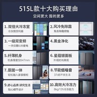 海尔Haier巨能冻系列BCD-515WLHSSEDS9风冷对开门冰箱,515L超大容量满足全家储鲜需求,265L超大冷冻空间远超常规冰箱,相当于额外配备一台小冷柜,特别适合中式家庭囤年货、存肉类、速冻食品等多样化需求,冷藏冷冻黄金比例设计让存储更高效。采用一级能效双变频技术,节能低耗,日均耗电不到1度,运行安静省电,长久保鲜同时降低用电负担。风冷无霜技术杜绝结霜烦恼,冷藏室干爽不凝露,果蔬持久水润新鲜,冷冻室食材不黏连,取用更方便,免去除霜麻烦,省时省力。冰箱内置高温煅烧锰基过渡金属除味系统,有效吸附硫、氮等异味分子,搭配微量纳米银离子抗菌技术,实现高效杀菌抑菌,确保箱内空气清新,食材原味留存更久。