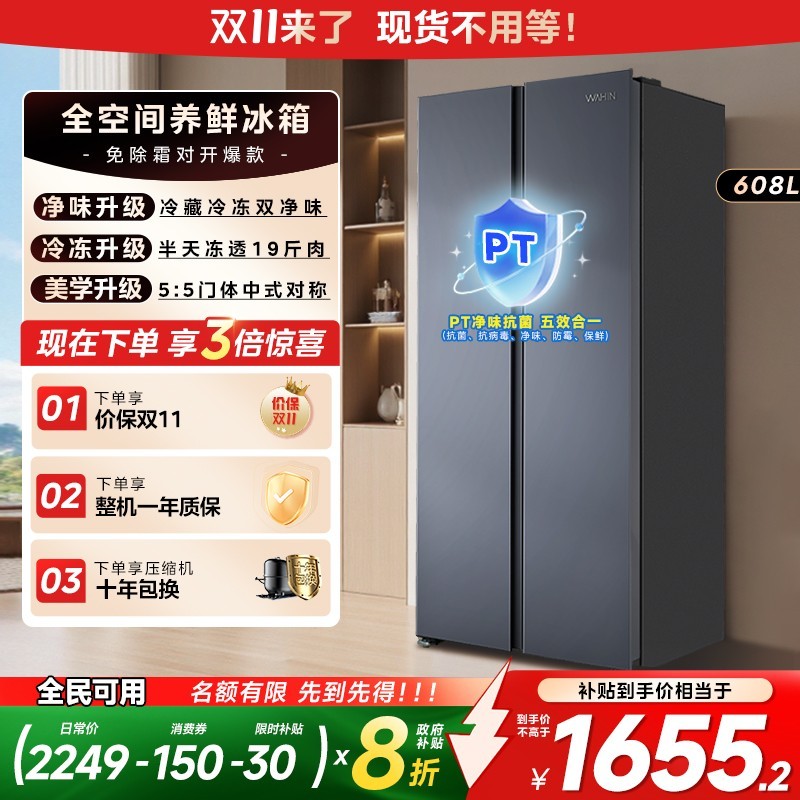华凌 HR-640WKP 仲夏夜风冷对开门冰箱,608L大容量设计满足全家储鲜需求,风冷无霜技术有效防止结霜,保鲜更持久,智能控温让食材保持新鲜口感。外观采用时尚仲夏夜配色,简约大气,适配多种家居风格。高效节能压缩机搭配低噪运行,省电静音两不误。
