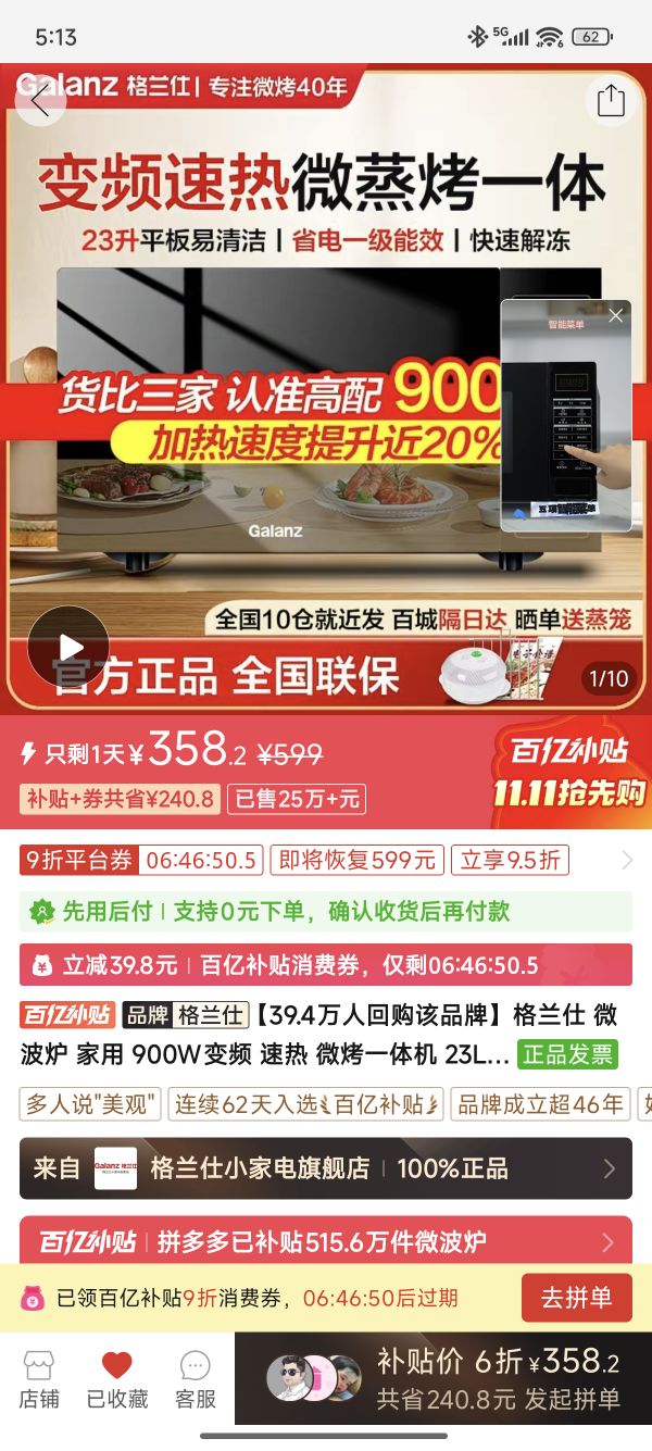 拼多多开启百亿补贴活动啦!格兰仕 Galanz 这款家用微波炉值得关注。它是 23L 大容量平板设计,清洁起来十分容易。具备 900W 变频速热功能,还是微烤一体机,满足多样烹饪需求。该商品原本售价 419 元,下单 1 件,店铺有 95 折优惠,到手价 398 元,再从页面百亿入口领取平台券,实际付款到手价只需 358 元,而且评价晒单还送蒸笼。这么实惠,赶紧入手吧!