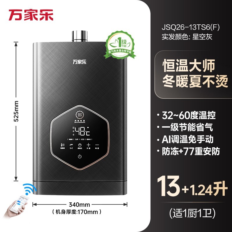 万家乐T6S安睡洗TS6S水伺服恒温燃气热水器J7RG1现重磅优惠,原价1799元,现天猫精选活动售价仅需1799元,叠加立减270元与480元双重优惠,并享受政府补贴15%最高减157.35元,最终实付低至891.65元,省钱省心超值入手!这款热水器搭载智能水量伺服器,配合燃气比例阀实现水气精准配比,有效稳压控流,水温恒定舒适,减少对宝宝娇嫩皮肤的刺激。升级精控水伺服系统融合三大恒温核心元件,全面优化洗浴体验,彻底告别水温忽冷忽热的烦恼。内置直流无极变频风机,支持一键ECO节能模式,智能调节功耗,持久节能更环保。高性能与低能耗兼具,品质生活从一台好热水器开始,限时优惠不容错过!