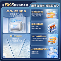 华凌60L电热水器BK5超薄扁桶设计节省空间美观大方,搭载3300W速热技术快速供应热水无需久等,采用一级能效标准节能省电长效使用更经济,内置稀土免换镁棒有效防腐防垢延长使用寿命,双胆结构实现分层加热并具备杀菌功能保障出水洁净,配备水质可视功能随时掌握用水健康状态,智能温控精准调节舒适沐浴体验。