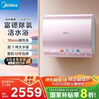美的 TECH亲肤活水玲珑扁桶双胆超薄电热水器60升,型号为UD9pro,具有富锶除氯功能,采用水电分离设计,达到一级能效。