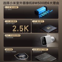 小米Xiaomi室外摄像机BW500,高清画质搭配智能夜视功能,全天候守护家庭安全,支持360°水平旋转和115°垂直视角,无死角监控庭院、门口等户外区域,IP66级防水防尘设计,无惧风雨,-20℃至50℃宽温域运行适应各种极端天气,内置AI人形侦测技术,精准识别移动物体并实时推送报警信息到手机APP,双向语音通话让你远程沟通更便捷,安装简单支持壁挂或吸顶多种方式,数据存储支持本地SD卡和云端双重保障。