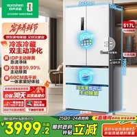 容声双净系列的BCD - 517WD2MPQLA风冷法式多门冰箱,拥有517L大容量,外观是雅士白配色,时尚美观。这款冰箱的型号为Ronshen容声BCD - 517WD2MPQLA - ET51,整机仅598mm超薄,能与家装橱柜完美契合,嵌入后面板与橱柜表面平齐,既避免磕碰又美观,两侧贴合橱柜和谐嵌入,干净不积尘还能释放更多厨房空间,与橱柜浑然一体,观感极佳。它具备负离子主动除菌杀毒净味功能,冷藏区和冷冻区双区净化,除菌除毒率>99.9%,净味率>99%,能全域净化呵护食材。