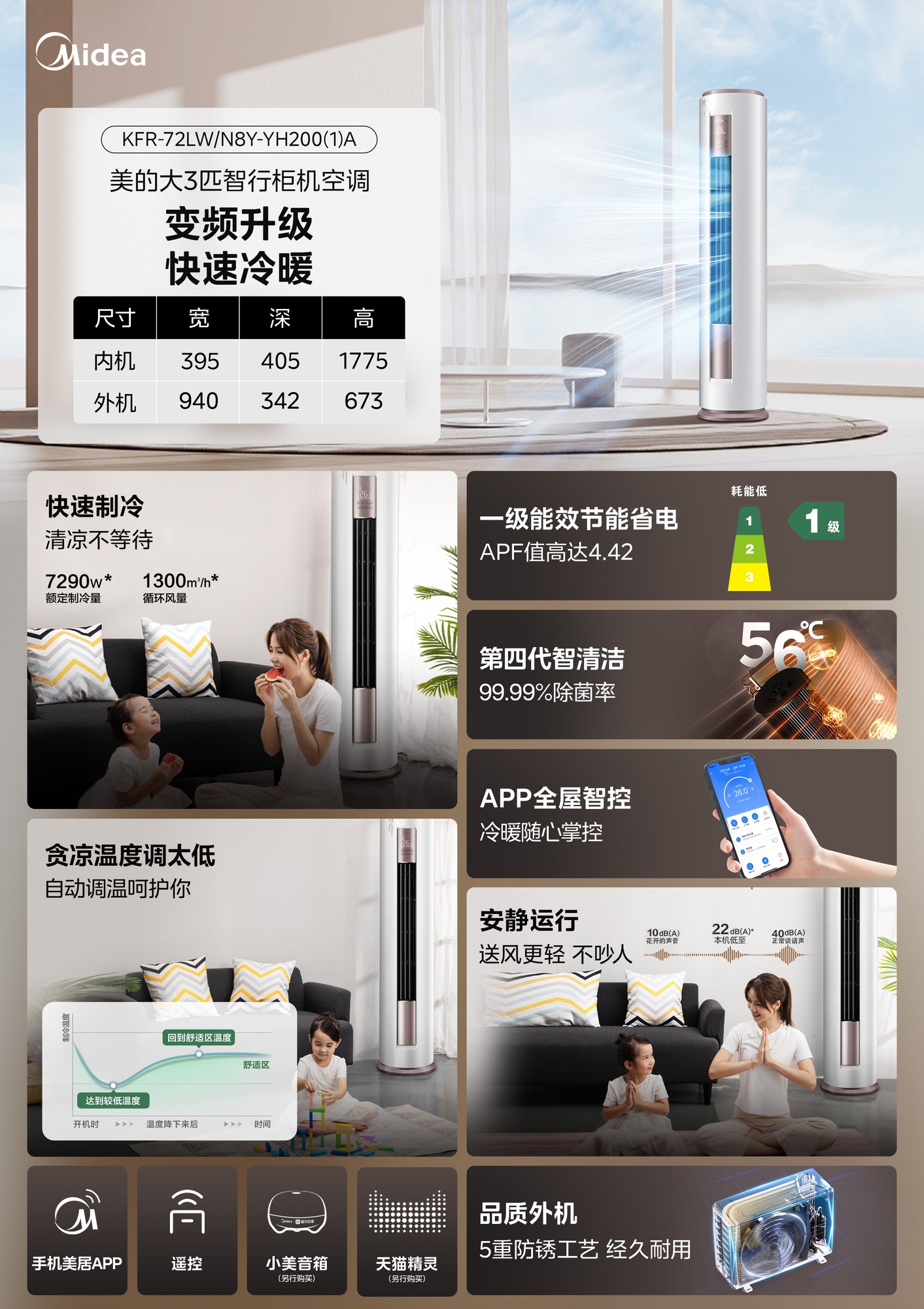 美的这款3匹立式空调柜机——智行机YH200,专为客厅打造,采用一级能效变频技术,冷暖两用。它具备一键智控温功能,能自动回温让人少着凉;拥有第四代智清洁技术,可使吹出的风更加洁净;还支持手机APP智控,能实现路上开机,回家就能享受清凉。制冷制热速度快,舒适温度无需久等。