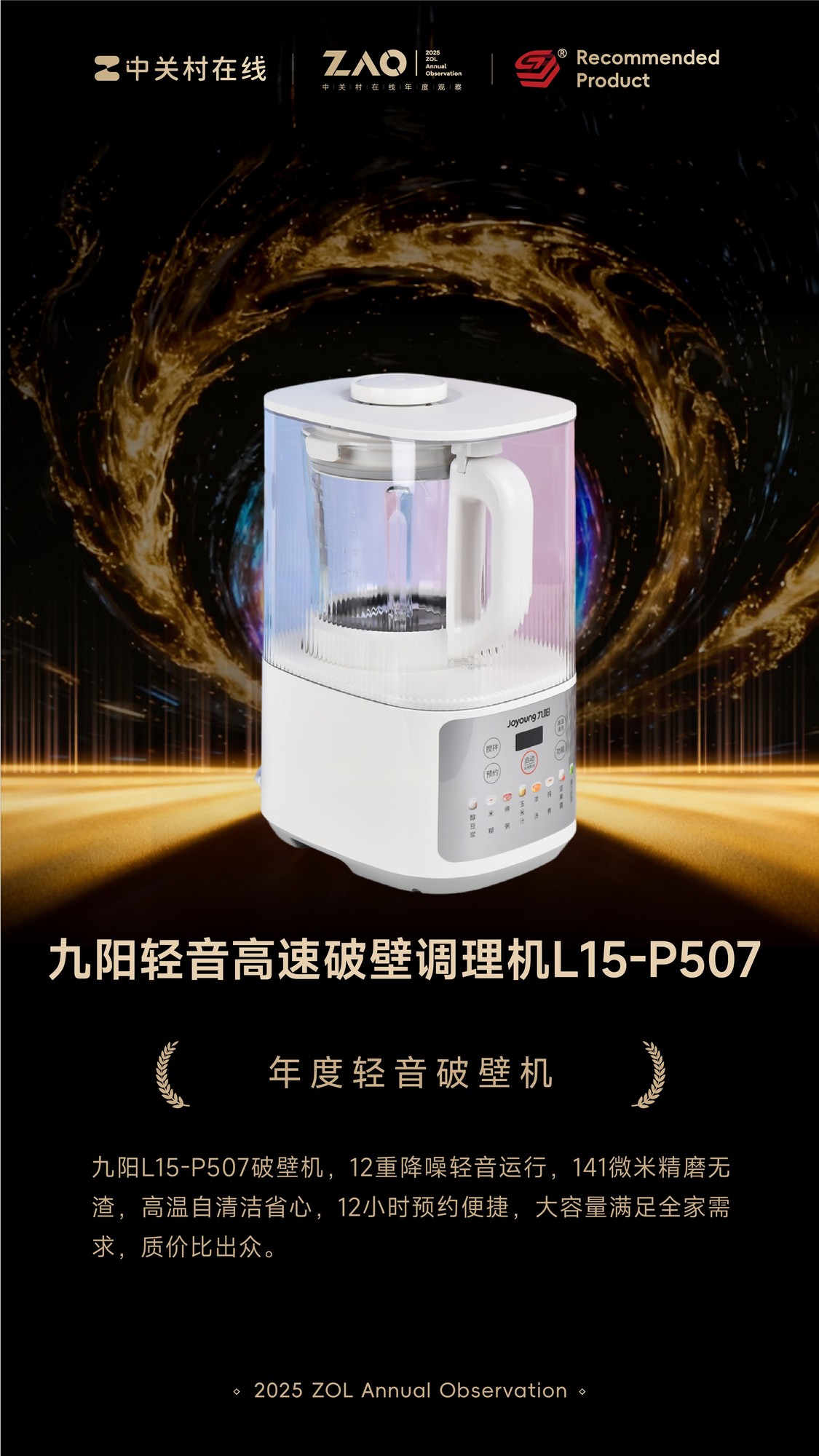 本文属于原创文章,如若转载,请注明来源:ZOL推荐2025年度轻音破壁机:九阳轻音高速破壁调理机L15-P507https://jd.zol.com.cn/1095/10958746.html