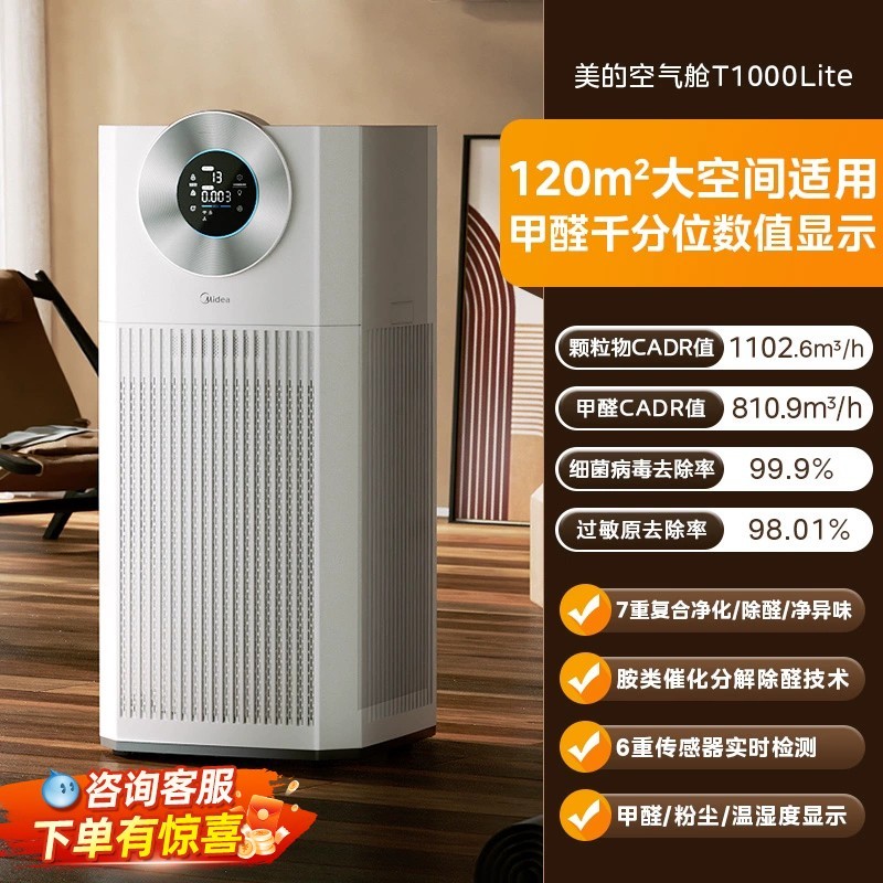 Midea空气净化器T1000lite专为家庭健康打造,高效去除甲醛、二手烟味、细菌及宠物毛发,特别适合有猫家庭使用,强力吸附猫毛和异味,营造清新洁净的居家环境。采用专业级滤芯系统,净化效率高达99.97%,实时监测空气质量并智能调节净化模式,操作简单,静音运行不扰眠。
