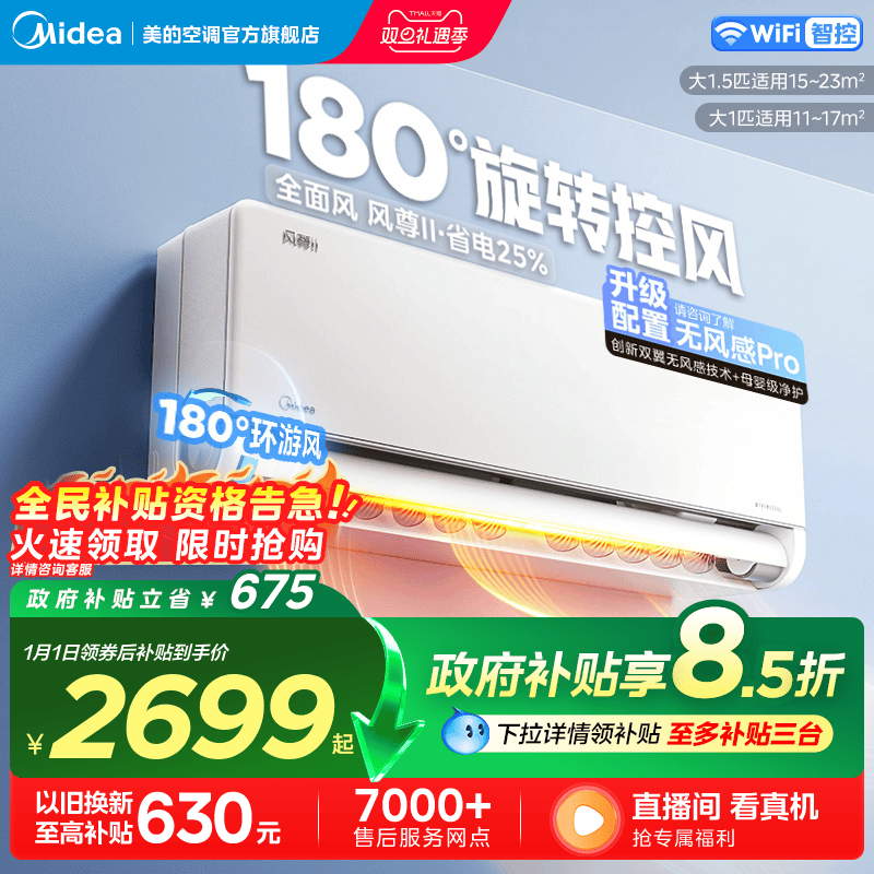 美的风尊二代N8MXC1Ⅱ 1.5匹壁挂式空调新一级能效现正火热促销中,原价4399.00元,现享国家补贴8折优惠,直降599.8元,最终到手价仅需2399.2元,超值入手还能享受全国联保7000+服务网点贴心保障。这款空调搭载180°旋转控风科技,均匀搅动全屋空气,实现快速全面的降温体验,无论是酷暑还是寒冬都能迅速调节舒适温度。创新五星舒适风设计避免冷风直吹,整晚护眠更安心。通过手机App一键开启酷省电模式,配合速冷热控制算法,压缩机高效运行,全天节能省电高达25%,真正做到清凉不伤电表,省电又省心。面板颜色简约百搭,适配多种家居风格,是品质生活的理想之选,喜欢就赶紧下单吧!