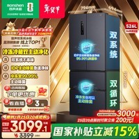 容声双净系列BCD-526WD1MPA风冷法式门冰箱,526升超大容量,采用双净化技术,高效除菌净味,风冷无霜设计让食材保鲜更均匀、不串味,法式四门布局科学分区,取用便捷省心省力;目前京东福建广东黑龙江等地区活动价3399元,叠加Plus立减、以旧换新30元及国家补贴15%后,实付低至2843.59元,原价3646元,直降超800元,性价比之选不容错过