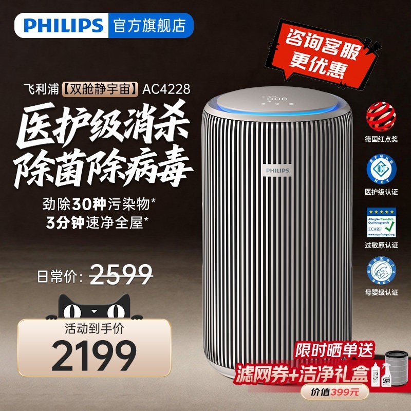 飞利浦空气净化器家用款AC4228,专为养宠家庭和空气质量敏感人群设计,高效去除甲醛、二手烟、猫毛、宠物异味及PM2.5等多重污染物,搭载VitaShield IPS微护盾技术与智能感应系统,实时监测并净化空气,静音节能,操作便捷;目前天猫精选活动售价3999元,参与立减480元优惠,下单1件实付仅需2199元,直降1800元,性价比超高,是提升居家呼吸健康的理想之选。