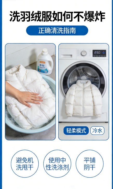 春节洗羽绒服,记住“一查二选三不做”:查水洗标、选手洗/低转速羽绒模式,不高温烘干、不暴力拧绞、不塞满洗衣机。小细节避大风险,让干净的羽绒服陪你安心过新年~