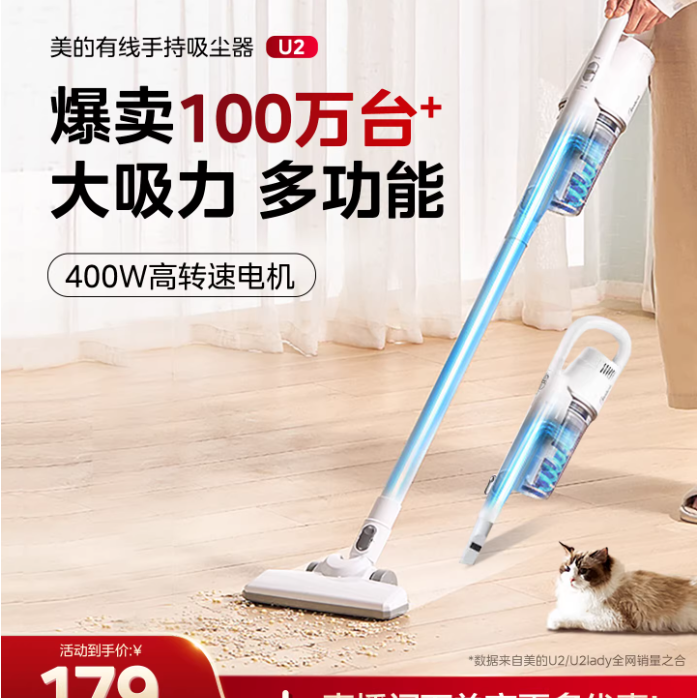 美的有线吸尘器家用大吸力手持大功率车载吸尘机U2,专为家庭清洁与车载场景设计,搭载强劲大功率电机,吸力充沛,轻松应对地板、地毯、沙发缝隙及汽车内饰等多场景灰尘毛发;有线供电持续稳定不掉劲,轻巧手持设计操作灵活省力,收纳方便不占地,今日活动到手价仅179元,直降150元,原价329元,性价比超高,清洁升级正当时!