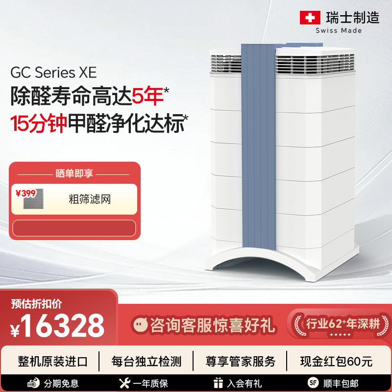 IQAir GC Series家用空气净化器作为高端净化领域的标杆之作,专为应对装修污染而设计,采用创新三级过滤系统:首层H11级HEPA滤芯高效拦截颗粒物与微生物;第二层搭载四组重达5.4kg的MultiGas双颗粒混合媒质滤芯筒,由活性炭与浸渍氧化铝复合而成,强力吸附甲醛、苯系物等有害化学气体及顽固异味;第三层静电滤芯罩有效防止媒介颗粒逸散,确保净化过程安全洁净;配合新型高效率风扇,洁净空气输出量提升41%,噪音降低7%,最大风量达1325m³/h,对≥0.3微米颗粒物的净化率高达99%以上,HEPA滤网寿命9-18个月,MultiGas滤筒与后置滤芯罩均可长效使用18-36个月。目前该机在天猫商城限时特惠,到手价仅16328元,直降2372元,降幅达13%,较此前爆料价更显诚意,品质之选不容错过。