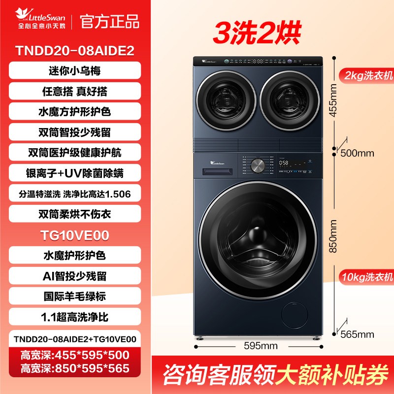 小天鹅迷你小乌梅系列懒人洗烘一体双筒三筒分区洗衣机套装组合,专为现代精致生活打造,小巧机身融入高颜值莫兰迪配色,轻松适配各类家居风格;双筒或三筒独立分区设计,可同时洗涤不同材质、颜色、脏污程度的衣物,真正实现高效分洗不串色、不串味,冷热双洗+智能烘干一机搞定;搭载纳米银离子除菌、桶自洁、AI智控等核心科技,洗净力强、护理更细致、操作更省心。