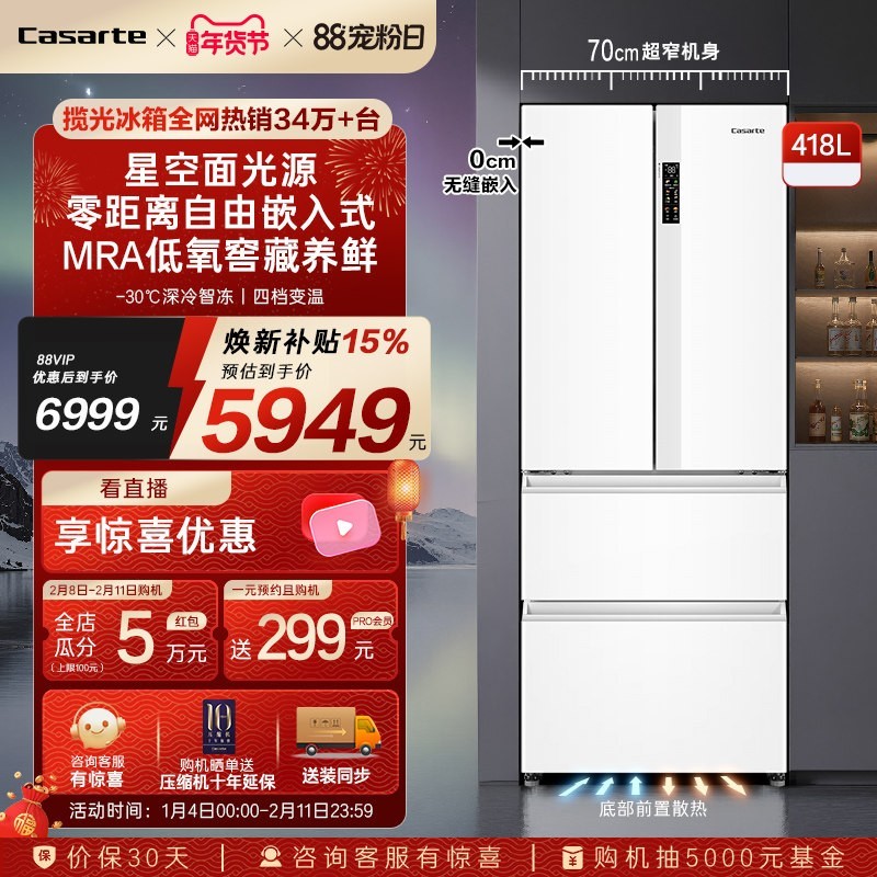 卡萨帝星空系列BCD-418WLCFDM4WKU1风冷多门冰箱418L云岩白款现已开启限时大促,原价9499元,立减1900元,到手仅需7499元!这款高端冰箱搭载MRA低氧窖藏养鲜科技,让果蔬轻呼吸、鲜嫩多汁、保鲜期更长;-30℃+深冷智冻技术快速越过冰晶带,锁住深海鱼等食材的原始营养与口感;Fresh Turbo Pro智慧动态杀菌实现六重洁净,层层守护全家饮食健康;四档变温精控,满足母婴、软冻、珍品、冰鲜等不同食材储鲜需求;更可直连海尔智家APP,随时随地远程调温,新鲜掌控更轻松。高颜值云岩白外观,融入现代家居毫不突兀,品质生活即刻开启!