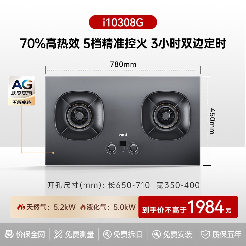 华帝小飞碟Max双边定时家用燃气灶i10308G,采用高端AG磨砂玻璃面板,灰白简约设计,轻松融入现代厨房;5.2kW超猛火力双灶头,左右独立定时、精准控火,支持天然气气源,嵌入式安装节省空间又美观;智能防干烧、熄火保护、童锁等多重安全配置,烹饪更安心。