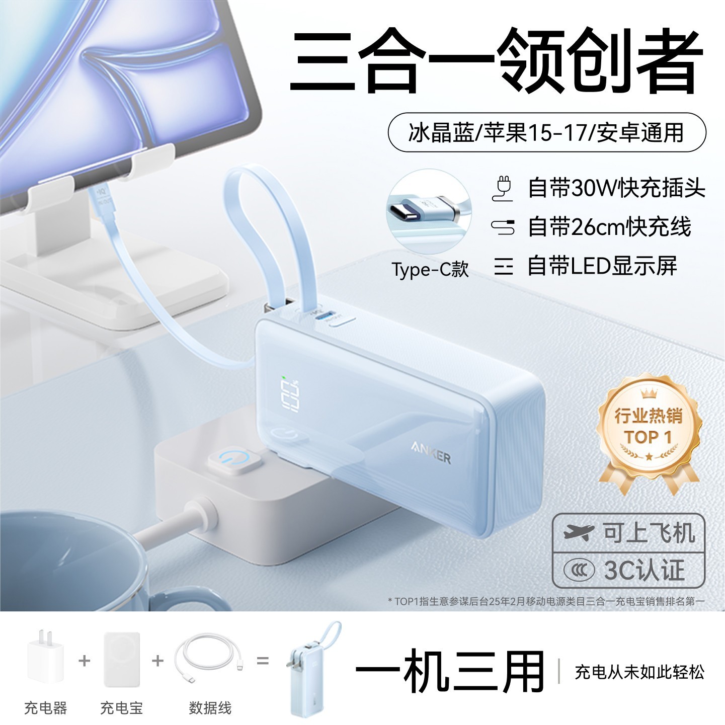 Anker A1633 移动电源充电器二合一Type-C 20W快充,10000mAh大容量电池,冰晶蓝配色时尚亮眼,通过苹果PD认证,自带Type-C充电线+Type-C双向快充接口,兼容苹果iPhone 15至17全系、华为及主流安卓机型闪充,出行办公一机搞定;原价379元,现天猫商城立减80元,到手仅需2...