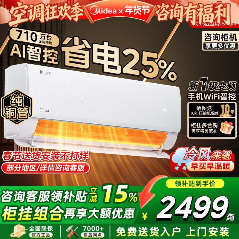美的酷省电大1.5匹一级能效变频冷暖智能挂机空调,采用全直流变频技术,节能省电更静音,支持APP远程智控、自清洁、高温自清洁、智能睡眠模式等多种实用功能,适合16-23㎡房间使用,制冷制热快人一步,运行平稳低噪,外观简约时尚,极地白配色百搭家居;原价4499元,现在补贴后到手仅2499元,直降2000元,性价比超高,有需要的朋友抓紧入手!