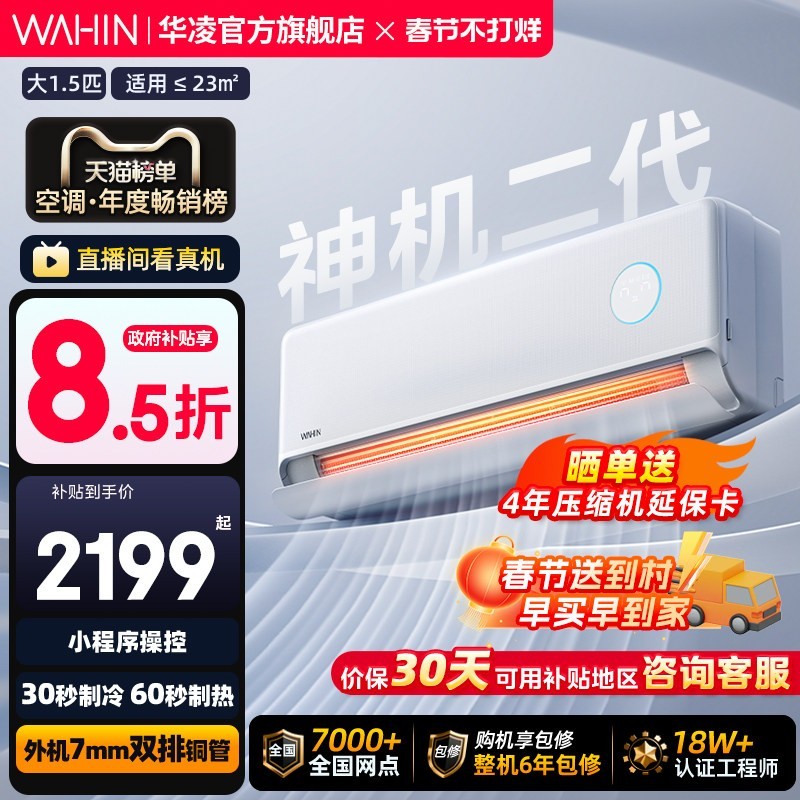 华凌神机二代系列KFR-35GW/N8HE1Ⅱ新一级能效壁挂式空调1.5匹,节能省电性能出众,APF值高达5.27,静音舒适送风,智能自清洁+高温除菌,快速制冷制热,支持APP远程操控和语音控制,安装便捷服务贴心;目前天猫商城限时促销,原价3399元,直降1200元,最终到手价仅2199元/件,性价比超高,有需要的朋友抓紧入手!