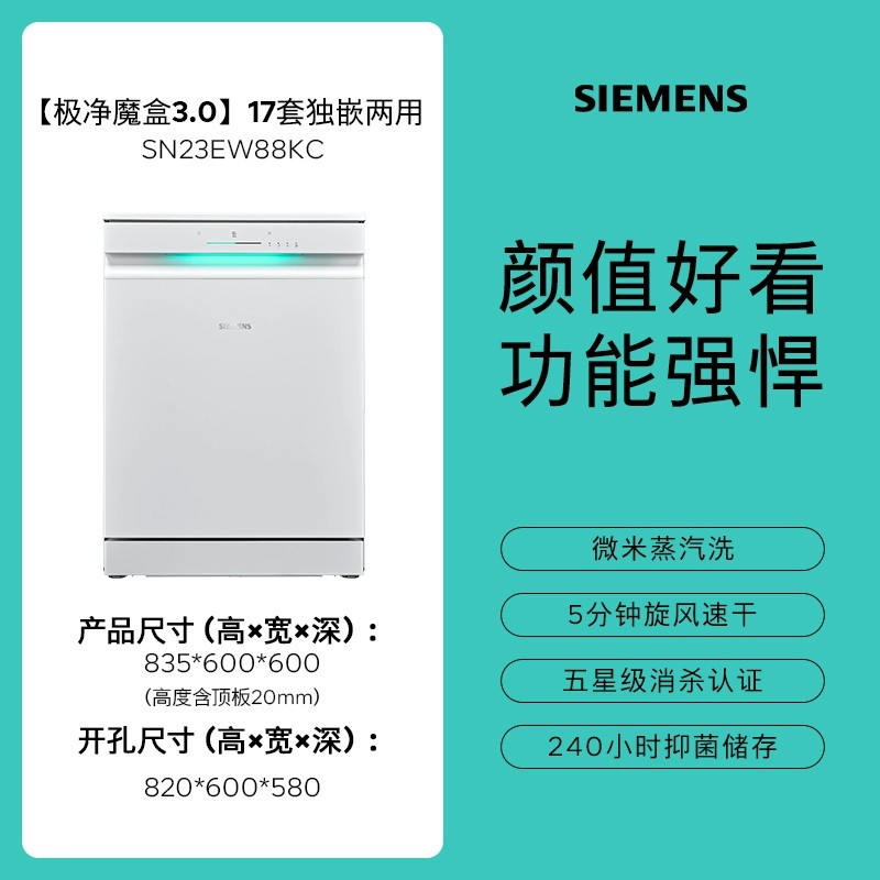 西门子极净魔盒Auto嵌入式15套大容量智能烘干洗碗机(型号SJ43EB88KC),颜色为经典黑色,采用全新魔盒3.0独嵌两用设计(需辛苦核对尺寸)。这款洗碗机拥有15套大容量,能满足家庭日常餐具的清洗需求,还具备智能烘干功能,让餐具清洗后更加干爽。