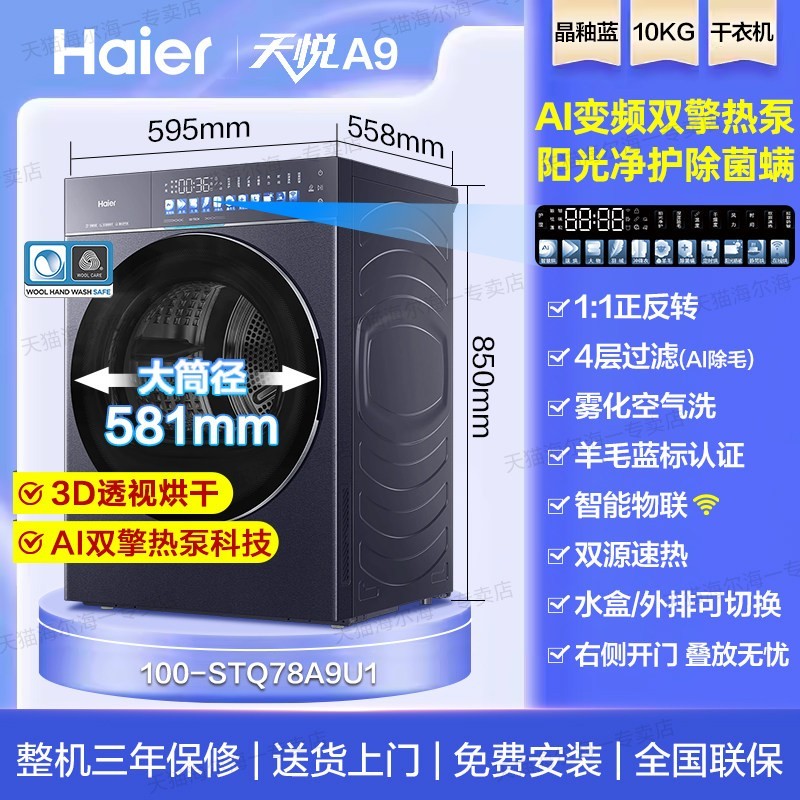 海尔云溪系列洗烘套装天悦A9直驱洁净新科技Pro洗衣机烘干机顶配,搭载直驱变频电机与AI智感洁净系统,深层净洗不伤衣,智能烘干精准控温不伤绒,双擎动力高效协同,洗净比高达1.15,烘干容量10公斤,支持空气洗、除菌螨、防皱免熨等多种高端功能,外观采用极简云镜面板与悬浮式设计,尽显轻奢质感;原价12999元,现天猫商城促销到手价仅5882元/件,直降超7100元,品质旗舰低价入手正当时。