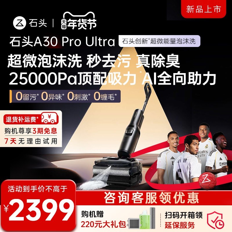 石头品牌2025年8月重磅推出的新品A30 Pro Ultra无线洗地机,搭载行业首创超微能量泡沫洗技术,微米级泡沫深入渗透分解顽固污渍,配合25000Pa超强吸力与30N滚刷下压力,真正做到一喷一推深层洁净;标配天然无刺激泡沫清洁液,含高端宠物洗护除臭成分,除菌率高达99.99%,搭配全链路银离子抗菌涂层与主动除臭模块,持续净化污水箱;双重鲨齿0缠毛技术彻底告别毛发缠绕困扰,12.5cm超薄躺平机身+滚刷全向贴边设计,清洁无死角;水箱下置结构结合AI全向智驾助力,操作轻盈省力;95°C高温自清洁+正反搓洗+智能脏污检测+多档烘干模式,洁净更彻底;升级软包电池提供60分钟长续航,循环寿命长,支持智能温控与防水防护;手机APP远程操控,自由调节吸力、出水量、滚刷转速,还能设置定时洗烘,智能又贴心。