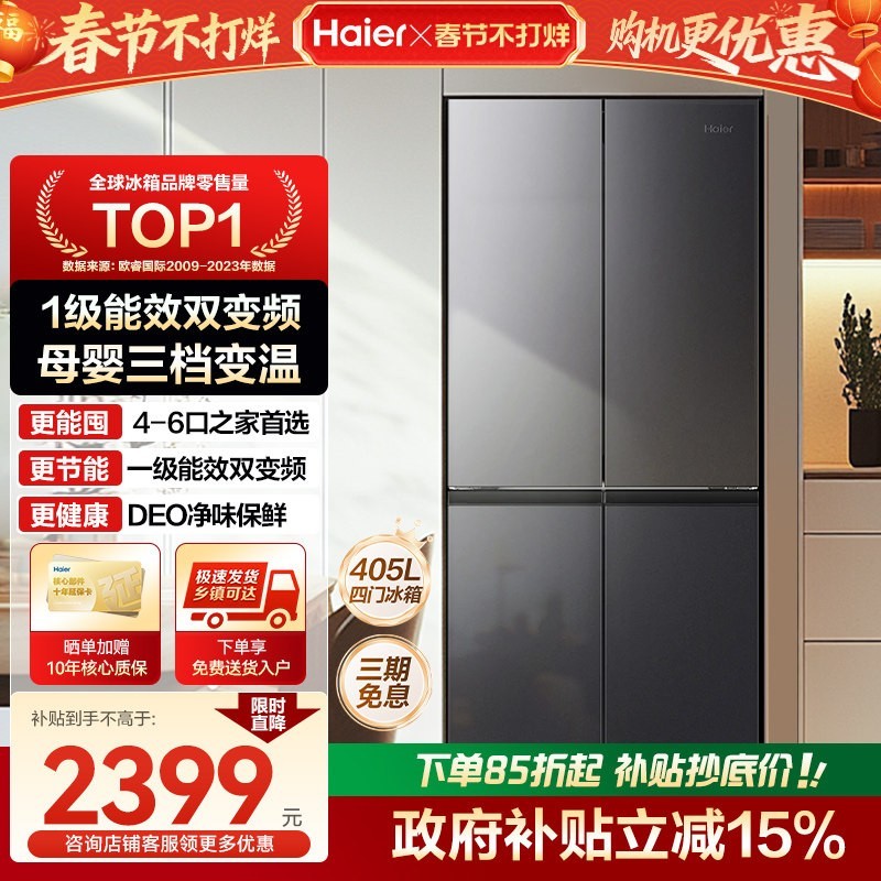 海尔 BCD-405WLHTDEDS9U1 风冷十字对开门冰箱,405L 星蕴银款来袭!这是海尔超薄变频大容量 T 型四门 405L 智能电冰箱,还是 2022 年 12 月重磅新品,拥有新一级能效。外观上采用星韵银色钣金面板,耐指纹抗刮擦,还能贴冰箱贴;冷藏有超大三档变温抽屉,零度/母婴/珍品三挡温度可按需调节;具备 DEO 净味保鲜功能,有效去除冰箱内异味和空气杂质;冰箱内部是环抱式均匀送风,避免冷风直吹食材,还原食物原味新鲜;深冷速冻能锁住营养不流失,急冻锁住新鲜,解冻也不流失营养;90°开门设计,贴墙放也能随意取放食材。