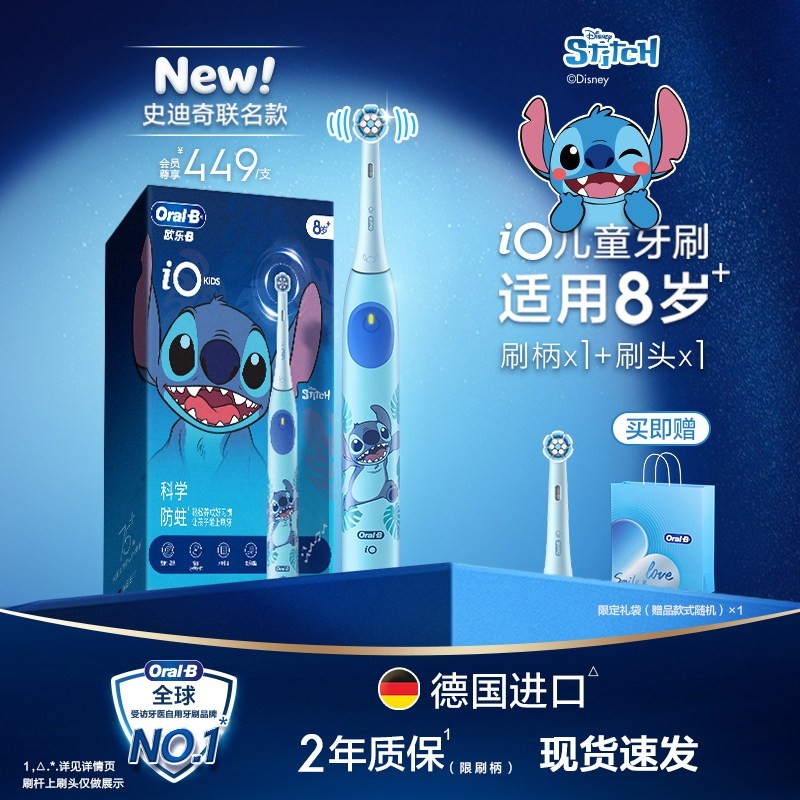 Oral-B欧乐B史迪仔儿童电动牙刷,进口官方旗舰品质,专为8岁以上儿童设计,搭载智能压力感应与温和软毛刷头,呵护娇嫩牙龈,趣味史迪仔造型激发孩子刷牙兴趣,让早晚刷牙变成快乐习惯;现在天猫精选活动售价599元,下单即领满599减150元优惠券,实付仅需449元,性价比超高,是送给孩子的健康智能好礼