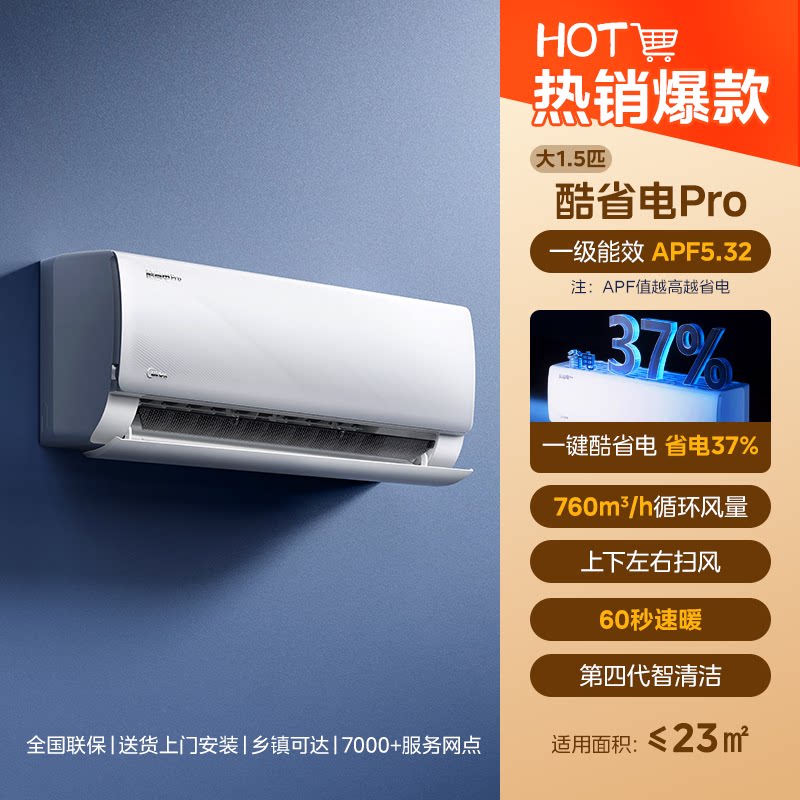 美的酷省电Pro系列KFR-35GW/N8KS1-1P新一级能效壁挂式空调1.5匹,搭载升级版节能科技,省电高达37%,制冷制热更快更静更省心,智能自清洁、高温除菌、防直吹等健康功能一应俱全,大1.5匹适用面积达16-23㎡,满足主流卧室客厅需求;目前天猫商城限时立减552元,原价4599元直降至2999元/件,性价比出众,有需要的朋友抓紧入手。