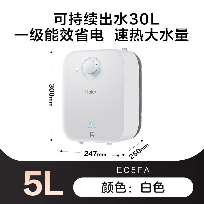 海尔 EC5FA小厨宝是一款适合厨房使用的小型迷你电热水器,它可安装在台下,具备速热功能,能提供大水量热水。这款小厨宝颜色为白色,外观简约。