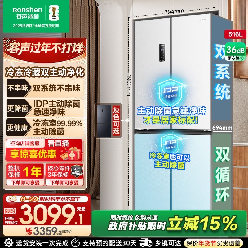 容声516L双净双系统十字四门风冷无霜家用一级冰箱,搭载双净双系统技术实现冷藏冷冻独立循环,有效避免串味,全空间四重净化守护食材健康;十字四门精分储鲜,516升大容量合理布局,风冷无霜免除手动除霜烦恼,一级能效节能静音更省心。