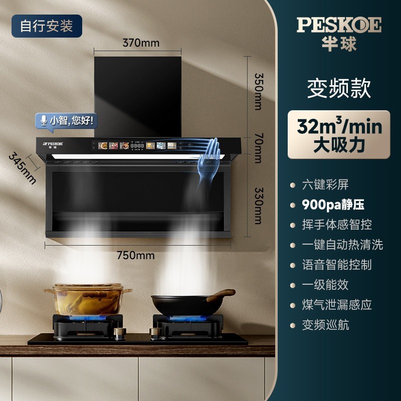 Peskoe顶侧双吸厨房家用大吸力抽油烟机燃气灶灶具二件套套装一体,为厨房烹饪带来便捷。抽油烟机具备顶侧双吸功能,拥有大吸力,能快速吸走厨房油烟,保持厨房空气清新。与之搭配的燃气灶也性能出色,火力强劲且稳定。