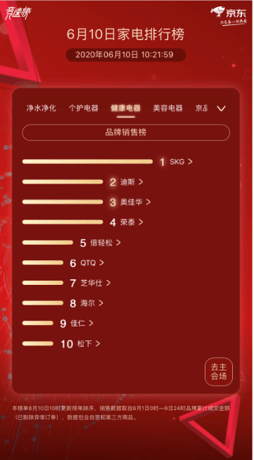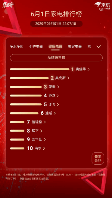 随着生活水平的提高,消费者对健康也越来越关注。体现在排行榜上,少不了一番恶战。比较1日、10日的销量累积榜单,我们可以看出变化较大。冠军宝座已经易主。在1日榜单上还占据优势的冠军奥佳华,在10日已下滑到第三,并与第一名SKG拉开了较大差距。暂居第二的迪斯表现优秀,从第六升至第二,但看与第三、第四的销量对比,优势并不明显,马上被反超也是分分钟的事儿。距离年中大典还有8天,各位要加油啊~