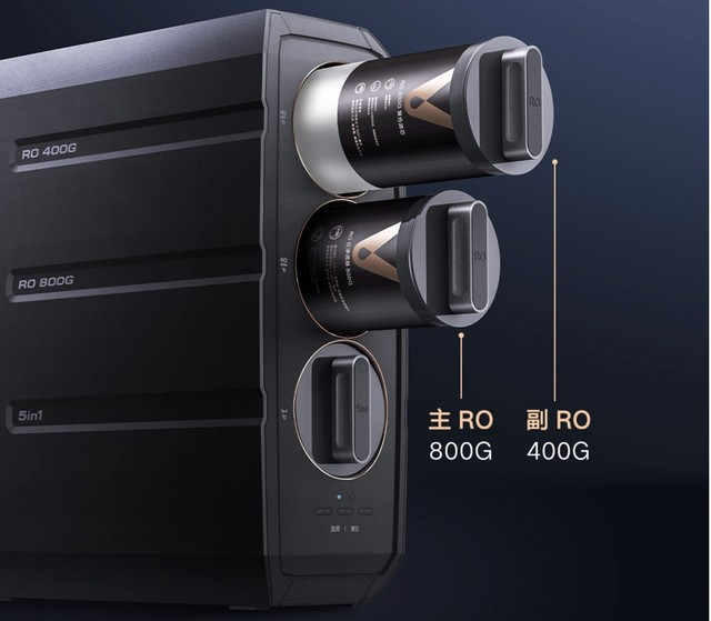 滤芯方面,8年长效主RO滤芯,无需频繁换芯更省芯,8年内每两年更换1根5合1复合滤芯及1根,副R0滤芯,即可享受1200G澎湃出水体验。