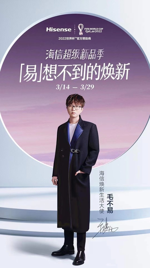 今日,海信正式官宣毛不易出任焕新生活大使,为春季新品代言,毛不易作为春季家电焕新形象使者将与海信真空冰箱携手掀起一场春季焕新浪潮,颠覆生活体验,给生活一个“易”想不到的惊喜。