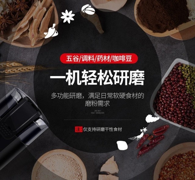 功能方面,它不只是可以研磨咖啡豆,还能研磨五谷、调料、药材等材料,做到最大程度的保证你不同场景下的日常需求,并且装配的一键研磨系统,能为忙碌中的你节约很多时间。