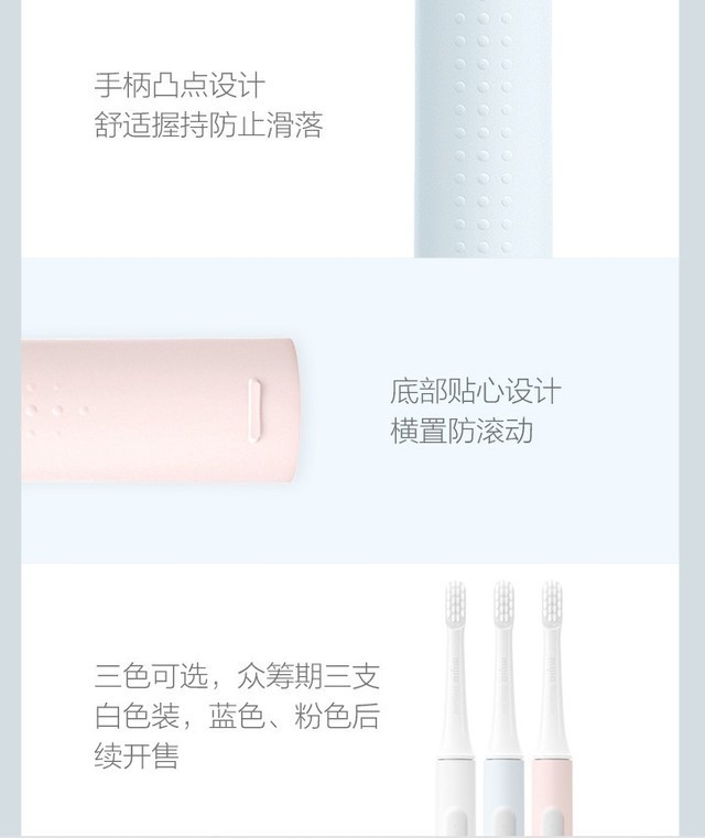 小米电动牙刷T100,外观简约年轻化,有3种颜色供大家选择。人性化设计,在手柄表面处有凸点,让你握持时不易滑落,底部表面有凸条,防止放置台面时滚动。使用后还可拆卸,随时可更换刷头,保证刷牙效率。