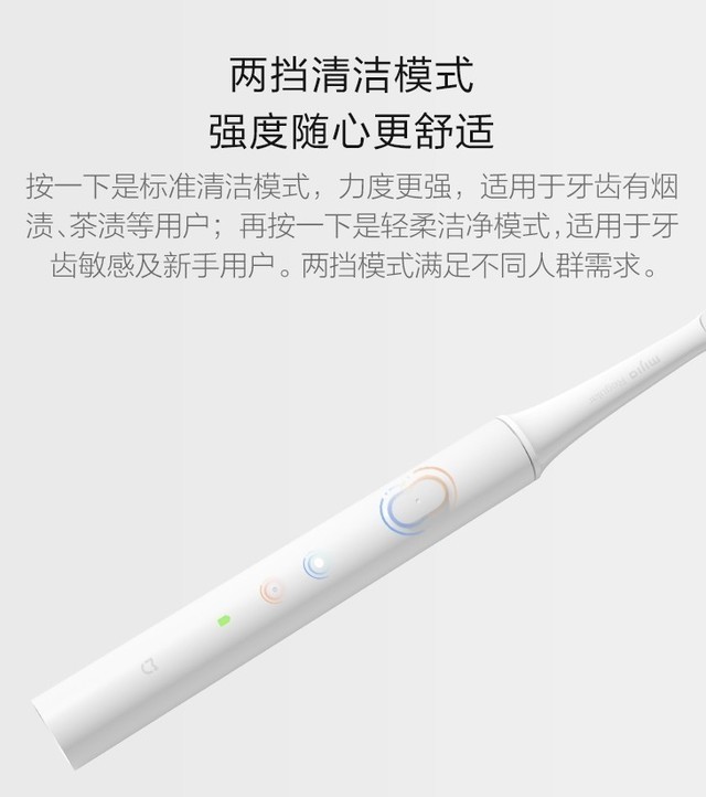 值得一提,小米电动牙刷T100还具有30天超长续航电池与可调节两档清洁模式,能够满足不同人群需求。